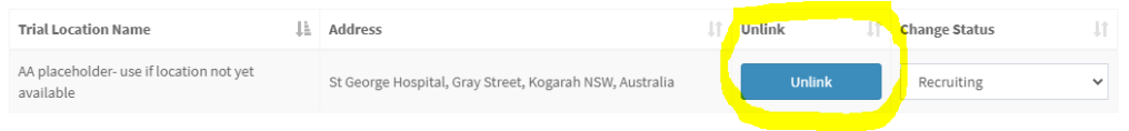 The “unlink” button was initially designed to give you the freedom to delete your accidental mistakes (oops!). This blue button has resulted in some confusion as well as the ability to accidentally unlink locations from outside your organisation. You will no longer be able to remove any Trial Locations from a trial once it’s been added so please double-check when you’re adding locations, and to close a trial please use the “Closed” status. Closed trials do not appear on the app. Of course, if you make a mistake or realise that there is a mistake in the database then please notify Customer Service at admin@clintrialreferapp.com and we can easily have the location removed for you.